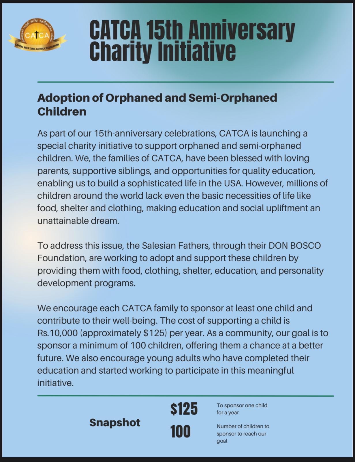 In addition to its primary sponsorship program, CATCA also extends its outreach to institutional support efforts, including assistance to Don Bosco Orphanage in Chennai, India. Through such contributions, CATCA reinforces its broader commitment to child welfare and community upliftment, supporting vulnerable children in safe and nurturing environments beyond its core sponsorship network.