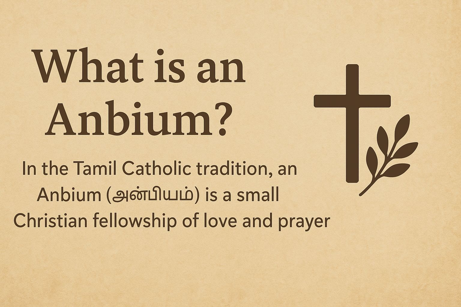 In the Tamil Catholic tradition, Anbium (அன்பியம்) means a fellowship of love. The word combines “Anbu” (love) and “-iyam” (a group or community), expressing the idea of people united by faith and love. Within the Church, an Anbium represents a small Christian community — families who live nearby and come together to grow spiritually, support one another, and serve the wider community.