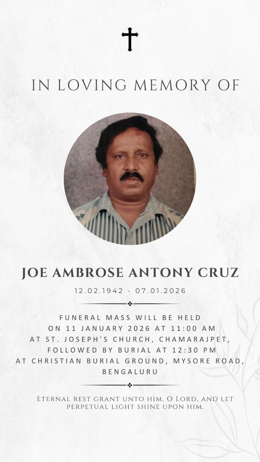 It is with deep sorrow that we announce the passing of Mr. Joe Ambrose Antony Cruz, beloved father of Flavia John Prabakar from Ellicott City Anbium. Her father passed away on 7th January in India. Our heartfelt condolences goes out to Flavia and the members of her family during this hard time. Please offer prayers for the departed soul. May his soul rest in peace 💐💐💐.