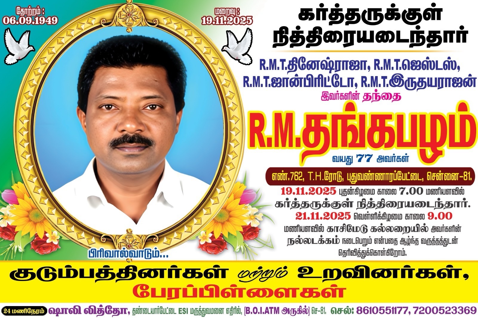 It is with deep sorrow that we announce the passing of Mr. Thangapazham (age 77), beloved father of Rajan (current board member) from Falls Church Anbium. His father passed away today in India. Our heartfelt condolences goes out to Rajan and the members of his family during this hard time. Please keep them in your thoughts and prayers. May his soul rest in peace 💐💐💐